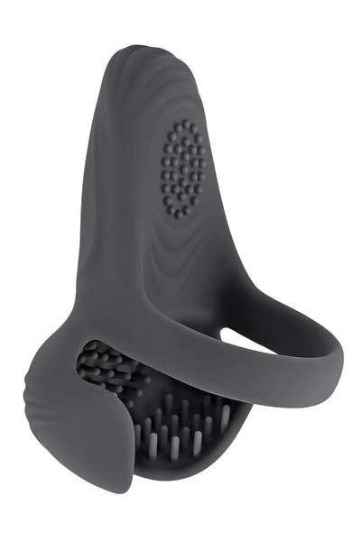This unique silicone toy has three features that interconnect - a large ring attaches to a hollow double-sided cup on one end and a vibrating wedge shape on the other. Textured and flexible, this harness, hoop & rounded scoop combo offers unique possibili