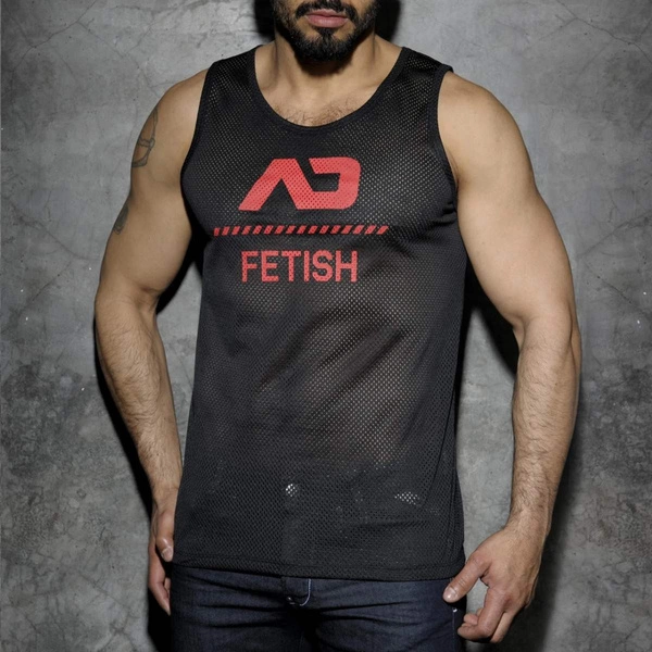 MESH TANK TOP – a lightweight tank top made of mesh fabric (100% polyester). Breathable and elastic, it ensures comfort and freedom of movement. The front features a printed AD logo and the word “Fetish”, giving it a bold and confident look.