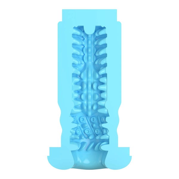 After Kiss to wymienny rękaw zaprojektowany dla serii Super Series, stworzony z myślą o wielowymiarowej, intensywnej stymulacji. Jego wnętrze zostało podzielone na trzy niezależne sekcje, z których każda zapewnia inną strukturę – od miękkich żeberek, przez spiralne wypustki, aż po skoncentrowane guzki o wyraźnym nacisku.